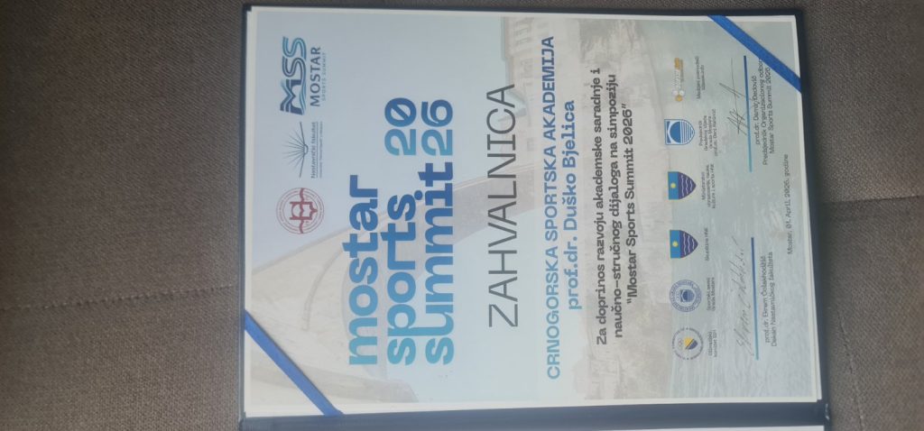 Na Mostar Sports Summit 2026. koji je odrzan 1.aprila , prof. dr Dusko Bjelica redovni profesor Fakulteta za sport i fizicko vaspitanje Univerziteta Crne Gore i predsjednik Crnogorske sportske akademije dobio je priznanje za doprinos razvoju akademske saradnje i naucno-strucnog dijaloga na tom simpozijumu.